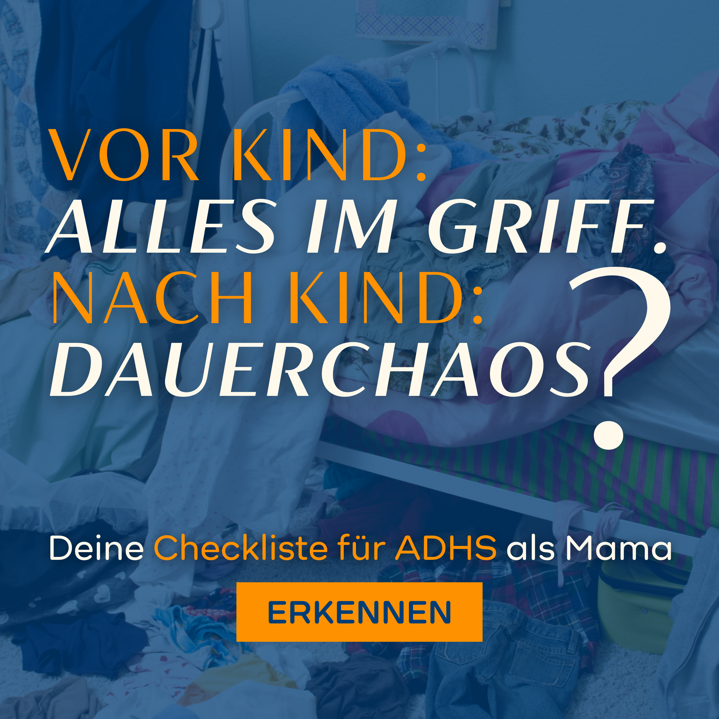 In dieser 0 € PDF bekommst du eine ausführliche Checkliste, die dir hilft einzuordnen, ob dein Chaos, deine Erschöpfung und dein Gedankenkarussell vielleicht mit ADHS im Mama-Alltag zusammenhängen.